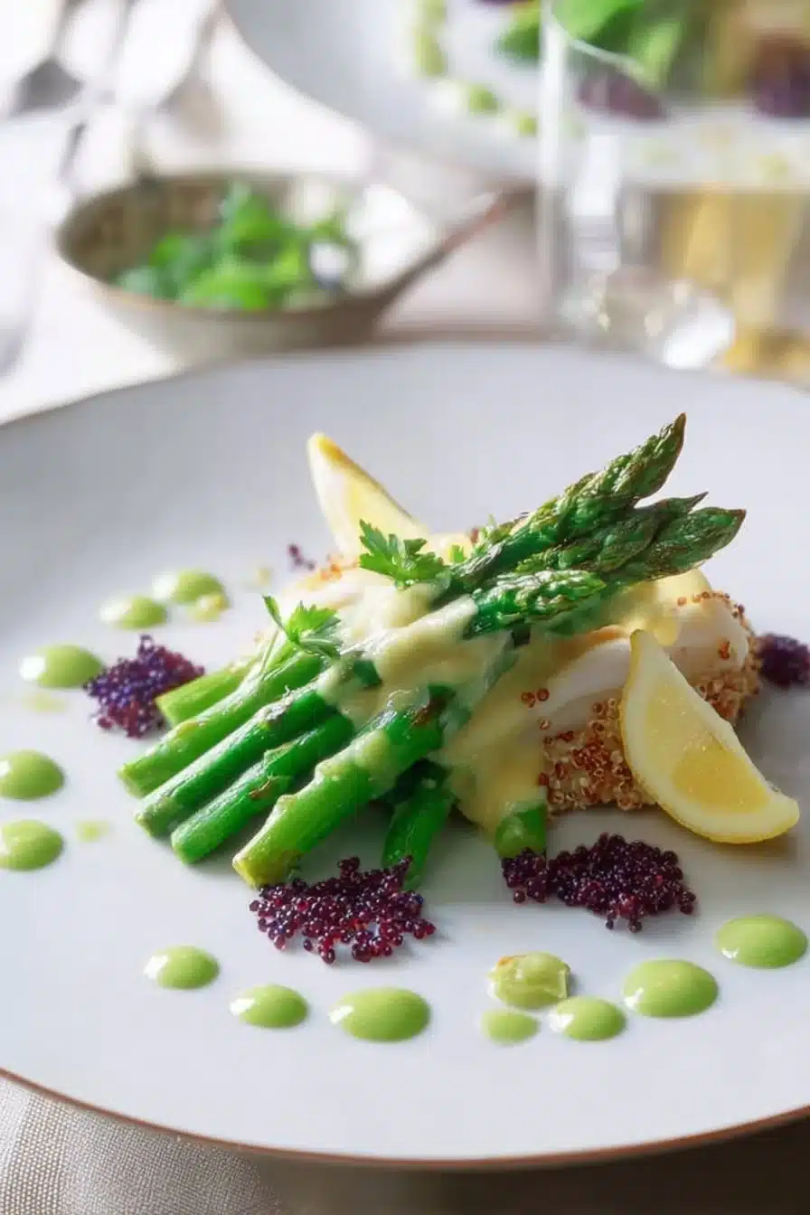 Une délicieuse salade d’asperges vertes et de quinoa agrémentée d’un sabayon citronné, idéale pour un repas léger et réconfortant.