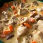 En fin de cuisson, incorporez la crème fraîche et mélangez bien. Vous remarquerez que la blanquette devient d’une belle couleur crémeuse et onctueuse. Cela semble si bon ! Servez chaud, accompagné de riz ou de pâtes pour profiter de chaque goutte de cette sauce délicieuse.