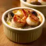 A comforting seafood casserole featuring tender scallops, juicy shrimp, and flavorful mushrooms in a creamy sauce.