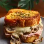 Un délicieux Croque-Monsieur aux champignons, fromage fondant et pain croustillant, parfait pour un déjeuner léger ou un dîner réconfortant.