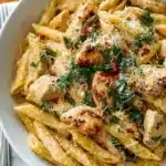 Pâtes au Poulet Crémeux à l’Ail et au Parmesan : Une Recette Confortante et Savoureuse