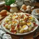 Cette salade de pommes de terre est bien plus qu’un simple accompagnement. C’est une véritable célébration de la cuisine familiale. Sa texture crémeuse, associée à des morceaux d’oignon doux et à des œufs durs, en fait un plat complet et satisfaisant. De plus, elle se prépare rapidement et se conserve très bien, ce qui en fait un choix parfait pour un pique-nique ou un déjeuner rapide durant la semaine.
